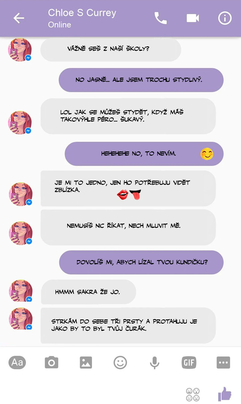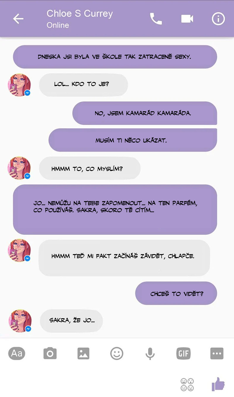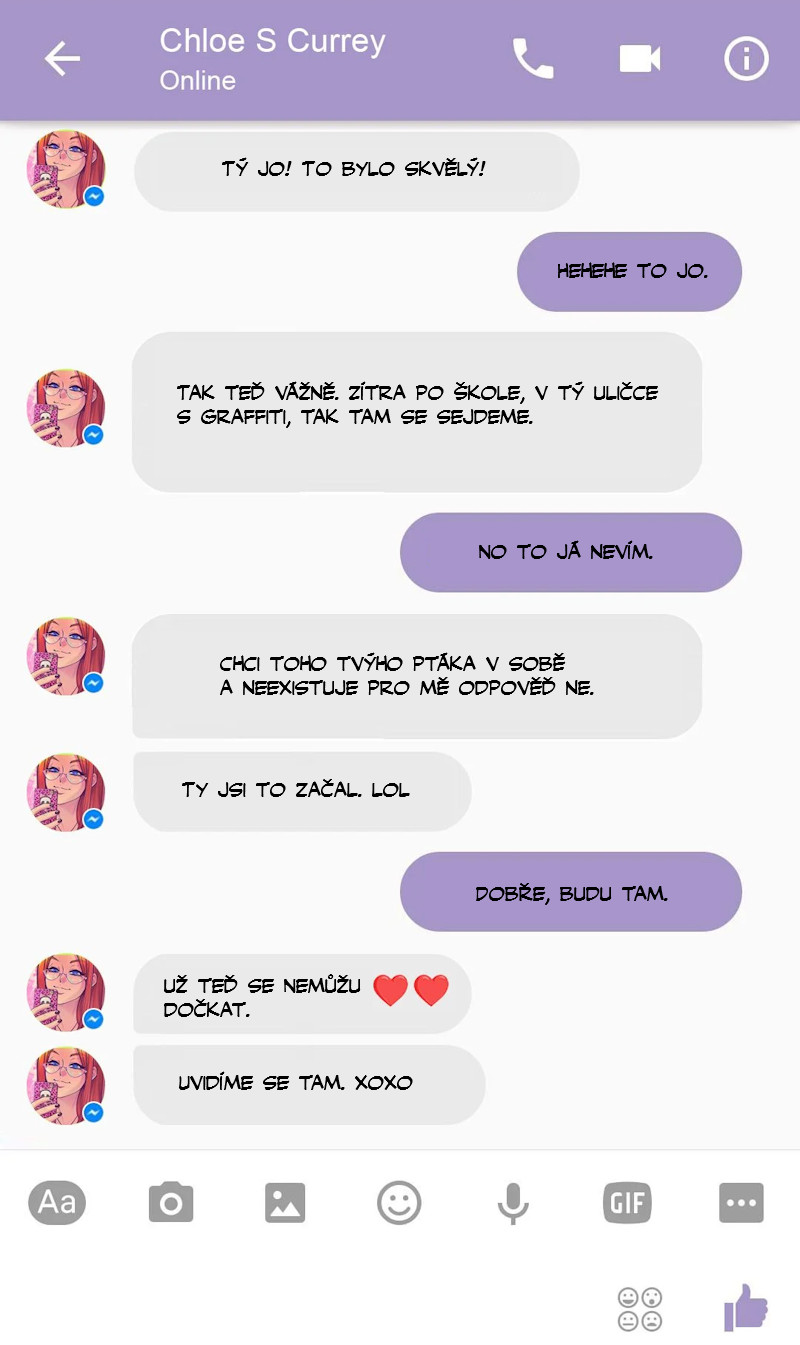 Studentka Chloe se se svými spolužáky ráda setkává na chatu. Dnes se spojí s kamarádem svého kamaráda. Chat se pořádně rozjede, až se oba pořádně udělají. Že by sex budoucnosti. Ale ne. Chloe tlačí na to, aby se zítra sešli doopravdy.